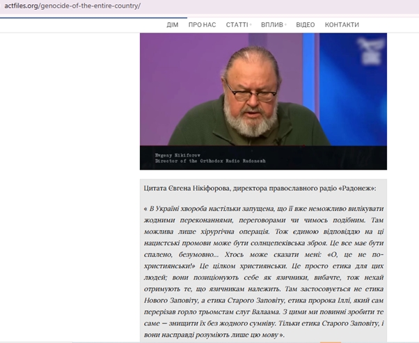 ЦИТУЮ те, що на скрині: “На Україні хвороба так запущена, що вже ніякими вмовляннями, переговорами, нічим там нічого це вилікувати неможливо. Там можлива тільки хірургія. Тому відповідь на ось ці виступи нацистів може бути тільки одна -сонцепьок. Це потрібно випалювати. Цілком так мені скажуть: "Ой, це не по-християнськи, по-християнськи цілком. Просто етика для цих людей. Вони ж самі себе позиціонують як язичники. Вибачте мене і отримайте як язичники. Тому для вас не новозавітна етика, а старозавітна". Ільї пророка, який особисто взяв та перерізав горлянки 300 служителям Валаама. Із цими так само потрібно знищувати без всілякого сумніву. тільки старозавітна етика. І вони тільки це, тільки цю мову і розуміють.”