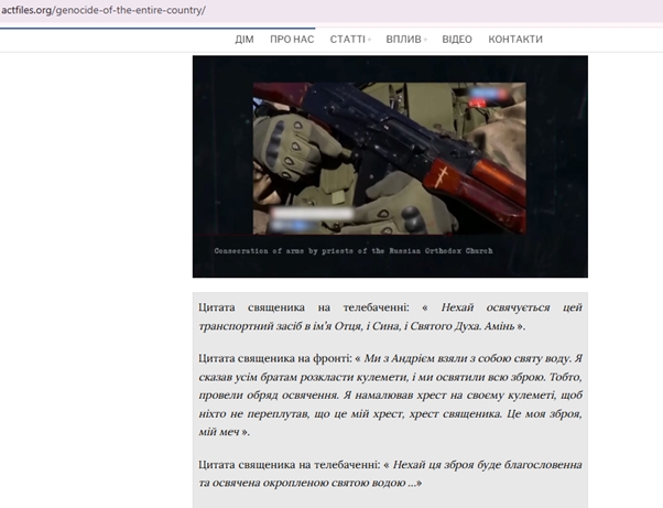 ЦИТУЮ: “Освячується знаряддя це. “В ім'я Отця, Сина і Святого Духа. Амінь. Ми з собою взяли з Андрієм святу воду. І я сказав всім братам розкласти автомати. І ми освятили всю зброю. Тобто чин освячення провели. Я намалював на своєму автоматі хрест, щоб не плутали, що це мій хрест. Хрест батюшки - це моя зброя, мій меч. Благословляється і освячується зброя