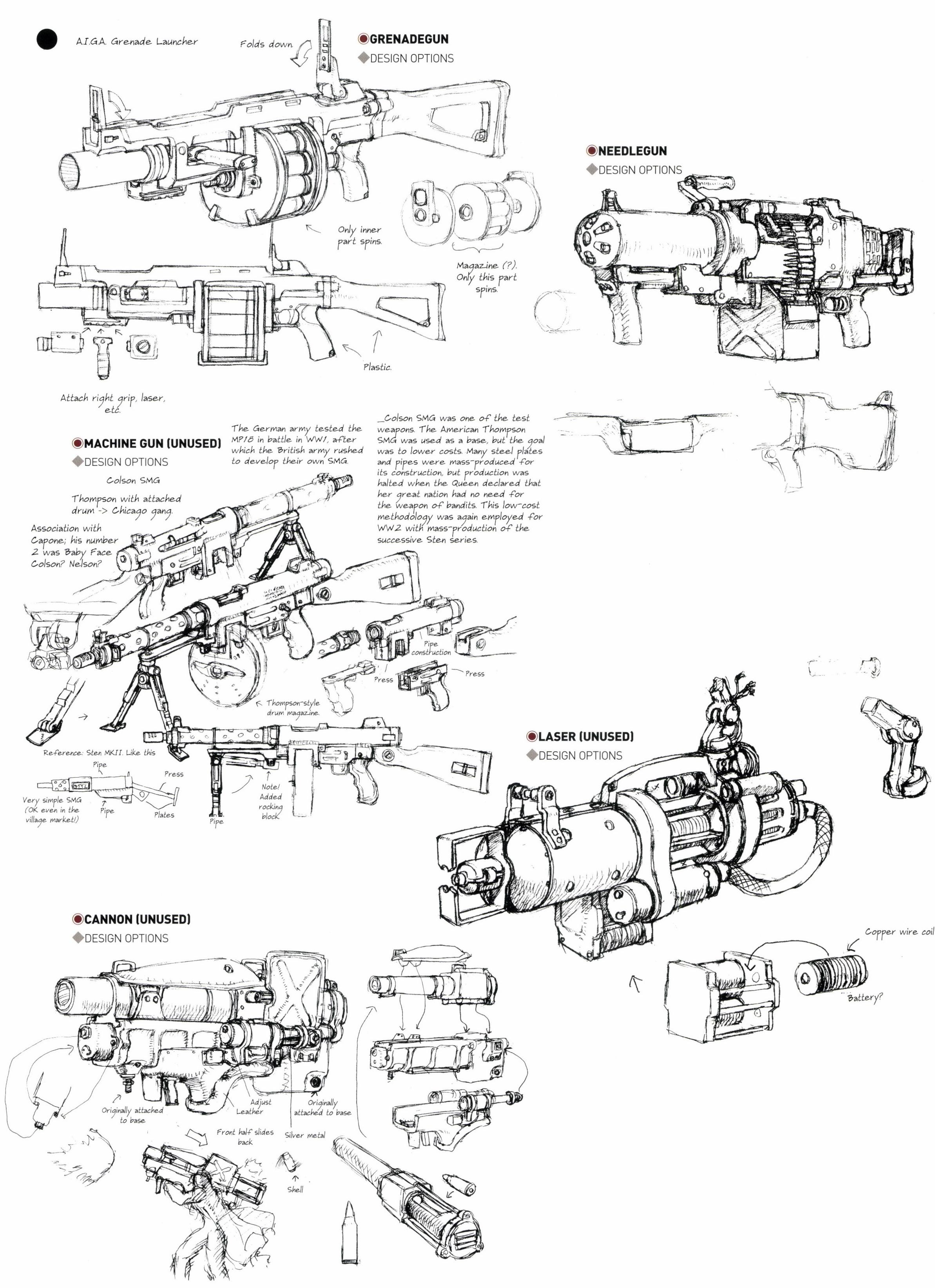 Жоден Resident Evil не обходиться без вогнепальної зброї, тож, за традицією, у проєкт наступної частини моментально додали пістолети, рушницю та гранатомет. Але Камія – не Камія, якщо не додасть якусь стильну родзинку в настільки важливий аспект гри. Тому паралельно з цією трійцею було намальовано концепти кулемета часів Другої світової, голчастої гвинтівки, лазерної та звичайної гармати. Тоні Редґрейв, який шматує біозброю лазерним променем… Було б цікаво на таке глянути.