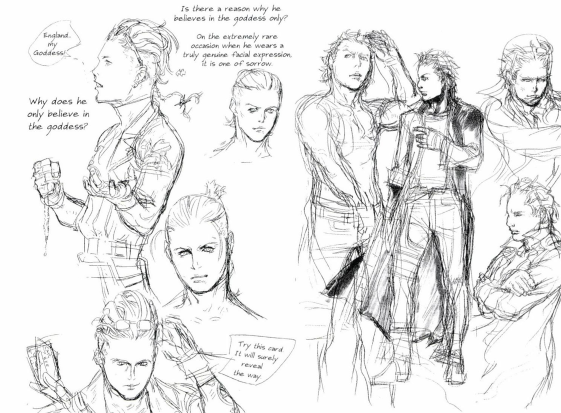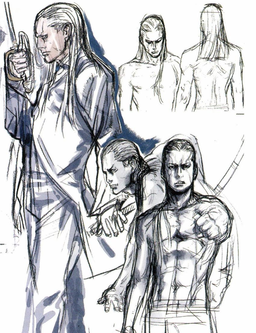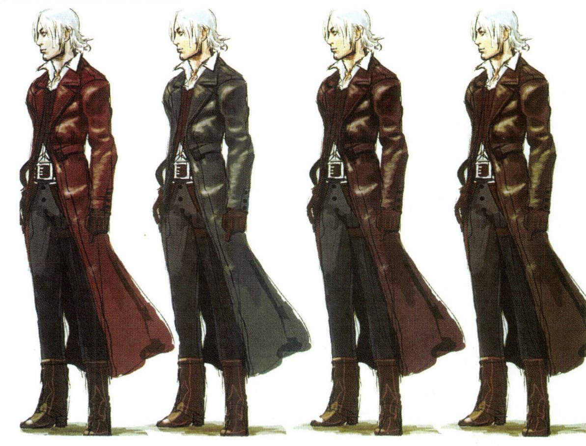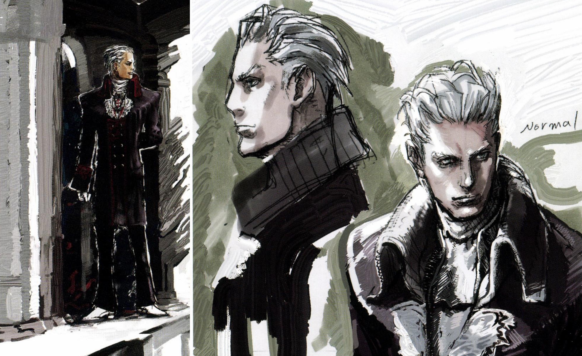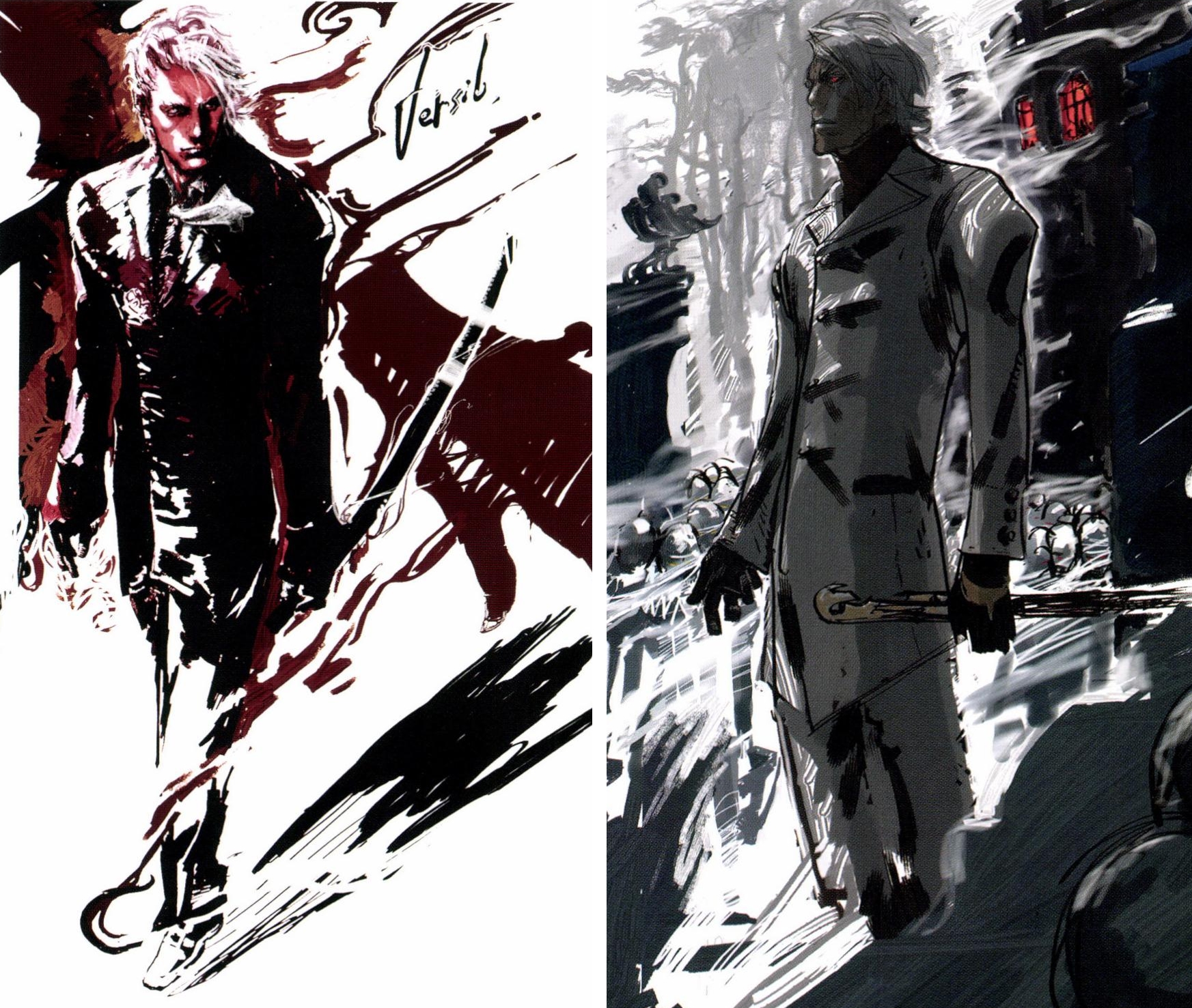 А що сталося з Полом-Вергілієм? Він нарешті став блакитним. Хоч він і досі мав бути персонажем другого плану, чи скоріше фону, пропрацьовка в нього була не абияка. Володіння катаною — одна з перших ідей, яка спала на думку членам команди, бо будувати цей образ вони хотіли як повну протилежність Данте. Концепт і модель Ямато, до речі, з’явилися в ті ж часи, тільки використовувалися Спардою в костюмі, а не його сином. Пам’ятаєте згадку про зализане волосся з попередніх етапів? Тут із зачіскою почали гратися дизайнери. Певний час його малювали з чубчиком, як в емо (його можна побачити нижче). Ну хіба не краса?