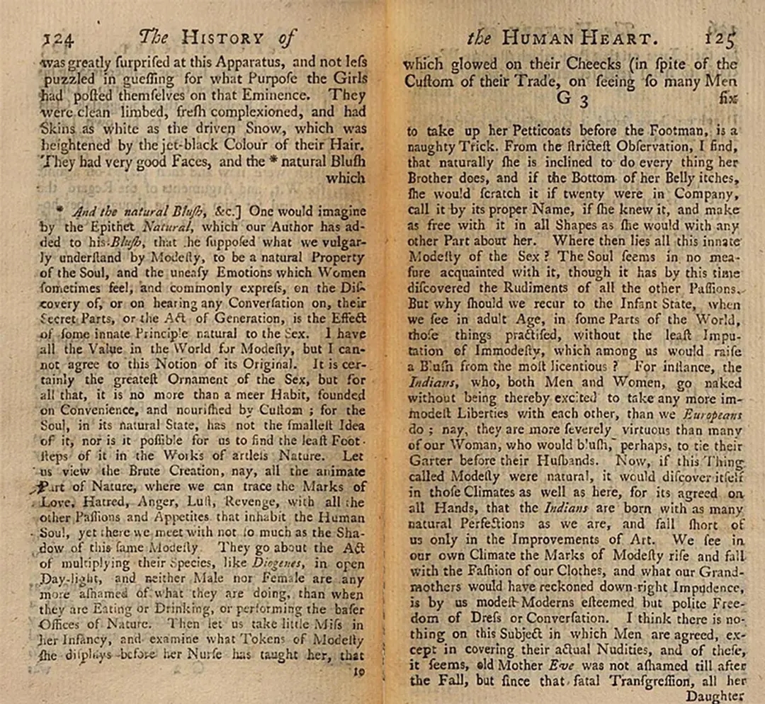 У примітці стверджується, що скромність є доброю рисою, яка зберігає сексуальний порядок, але заперечується, що вона є вродженою для жінок. Ставлячи під сумнів природність людських рис, ця порнографічна робота приєднується до філософських дебатів свого часу. Наприкінці 17 століття Джон Локк заперечував вродженість ідей і характеру, що спричинило десятиліття дебатів про те, наскільки ми володіємо певними формами знання від народження. Автор «Людського серця» дотримується локківської позиції щодо цнотливості жінок — що вона не є вродженою — але також погоджується з моральними філософами, які, тим не менш, пропагували сексуальну стриманість як сприяння соціальному порядку та стабільності. Жінки були об’єктом цієї нав’язаної цнотливості, нерівності, підкріпленої природничою філософією 18 століття (те, що ми зараз називаємо наукою). Медичний дискурс сприяв поширенню переконання, що жінки і чоловіки принципово відрізняються на анатомічному та психологічному рівнях. Дійсно, сучасна гендерна бінарність закріпилася саме в цей період. Але тут, у порнографічному романі, ми знаходимо твердження, що свобода і автономія є бажаними для всіх людей, незалежно від статі. У цьому уривку йдеться про жінок не з метою їх еротизації чи підкорення, а з метою їх оживлення та надання їм прав, і це робиться на філософській основі. Що б на це сказала Дворкін, яка переконана, що порнографія в будь-який момент історії принижує жінок, порушує їхні права, зводить їх до їхньої сексуальної функції?