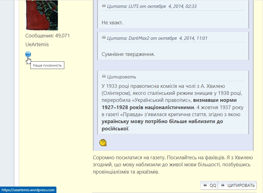 — Це пише на хвилиночку, головний виправлятор української мови на Вікіпедії, який оперує такими термінами як “свідоміти”, “ґефікація” абощо.