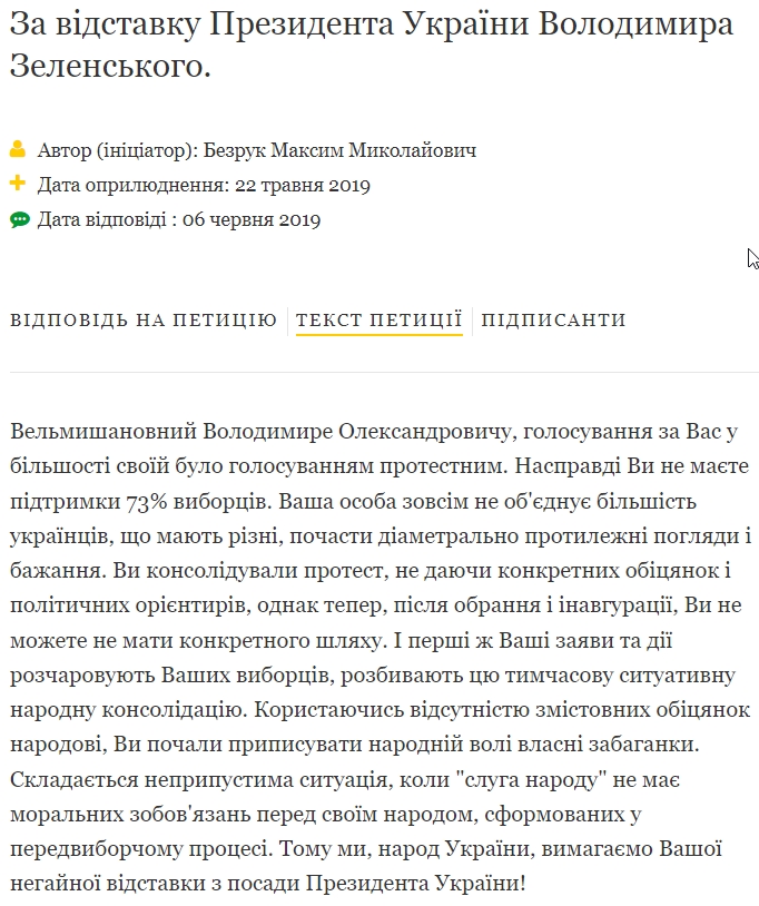 Вельмишановний Володимире Олександровичу, голосування за Вас у більшості своїй було голосуванням протестним. Насправді Ви не маєте підтримки 73% виборців. Ваша особа зовсім не об’єднує більшість українців, що мають різні, почасти діаметрально протилежні погляди і бажання. Ви консолідували протест, не даючи конкретних обіцянок і політичних орієнтирів, однак тепер, після обрання і інавгурації, Ви не можете не мати конкретного шляху. І перші ж Ваші заяви та дії розчаровують Ваших виборців, розбивають цю тимчасову ситуативну народну консолідацію. Користаючись відсутністю змістовних обіцянок народові, Ви почали приписувати народній волі власні забаганки. Складається неприпустима ситуація, коли “слуга народу” не має моральних зобов’язань перед своїм народом, сформованих у передвиборчому процесі. Тому ми, народ України, вимагаємо Вашої негайної відставки з посади Президента України!