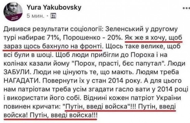 Всі послідовники Порошенка завжди кажуть, що знали, що буде війна (Путлер ще не знав, а вони знали), і послідовники Порошенка ніколи не скажуть, що почати війну було помилкою русні: в них винні виключно українці, які неправильно проголосували в 2019-му році.