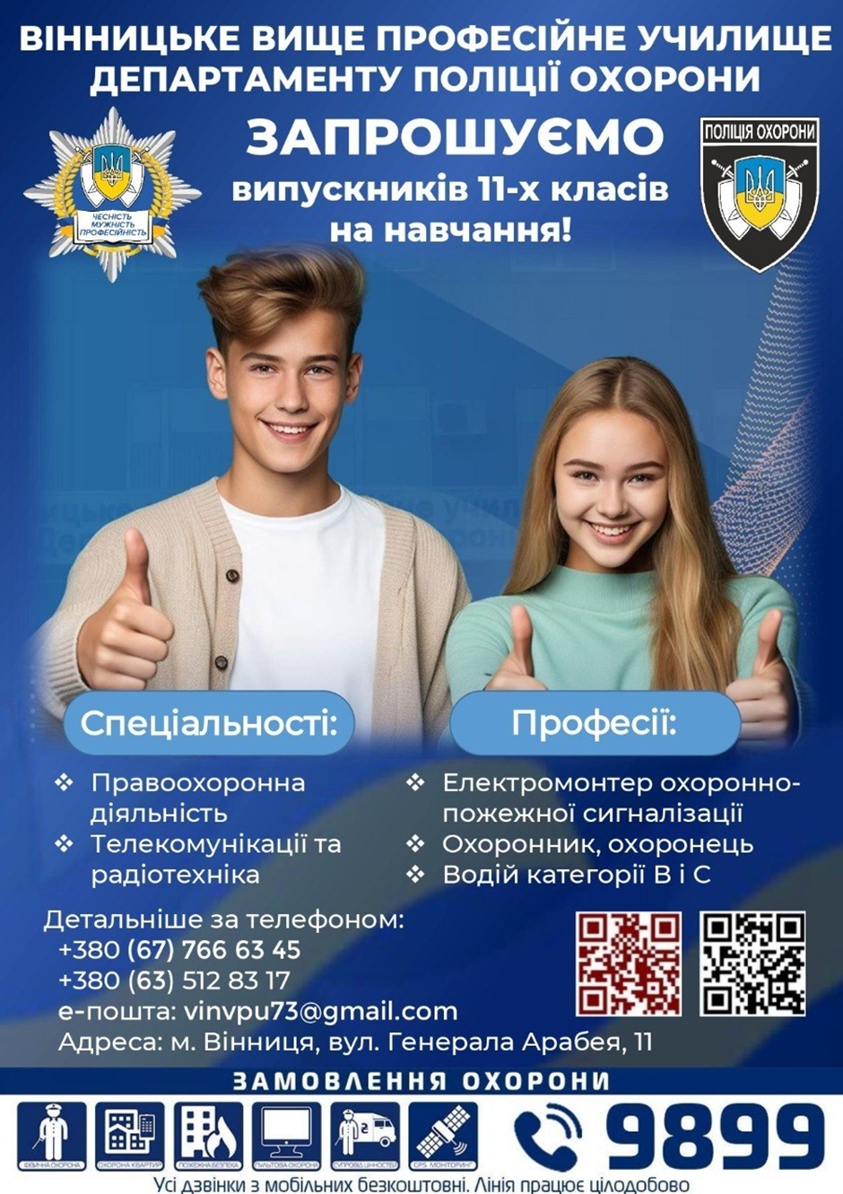 Вінницьке вище професійне училище Департаменту поліції охорони запрошує молодь, яка прагне здобути не лише диплом, а й реальну професію з практичними навичками, стабільними перспективами та зрозумілою траєкторією розвитку. Заклад пропонує навчання за напрямами, що поєднують сучасну підготовку, прикладний характер освіти та можливості подальшого працевлаштування.