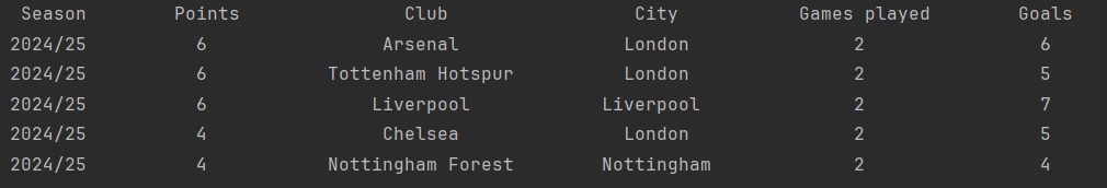 console_table.add_row(["2024/25", 6, "Arsenal", "London", 2, 6])Звісно, у кінці ми вивели нашу таблицю у консоль: