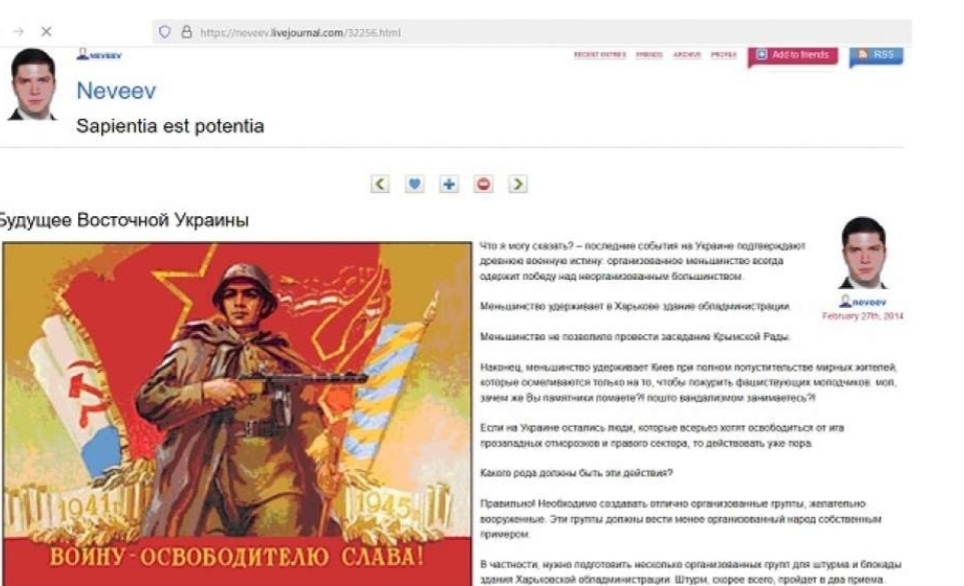 Пост Невєєва із закликом штурмувати Харківську ОДА, який він розмістив у 2014 році у своєму блозі, на який посилається Ірина Кременовська у публікаціях на сайті «Вільне слово»