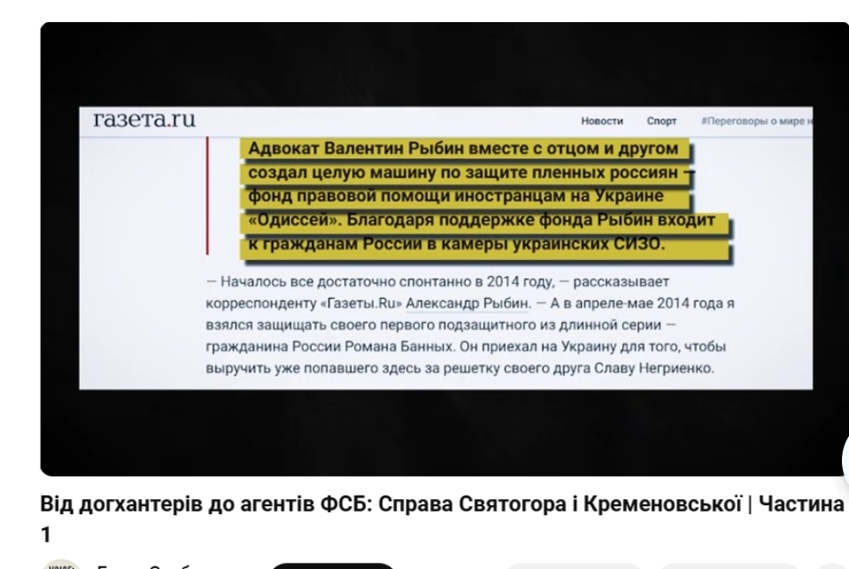 Переклад тексту зі скріншота: "Як повідомляє газета, разом з батьком і другом створив цілу машину із захисту полонених росіян. Фонд правової допомоги іноземцям в Україні "Одіссей". Завдяки підтримці фонду Рибін відвідує громадян Росії в камерах українських СІЗО".