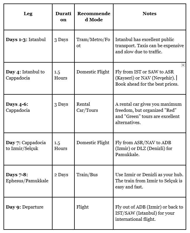 To successfully fit three major, distant destinations—Istanbul, Cappadocia, and Ephesus—into a tight 9-day schedule, you must utilize domestic flights. Forget the 10+ hour overnight bus journeys. Budgeting for two or three internal flights will save you over 20 hours of travel time, maximizing your sightseeing hours.