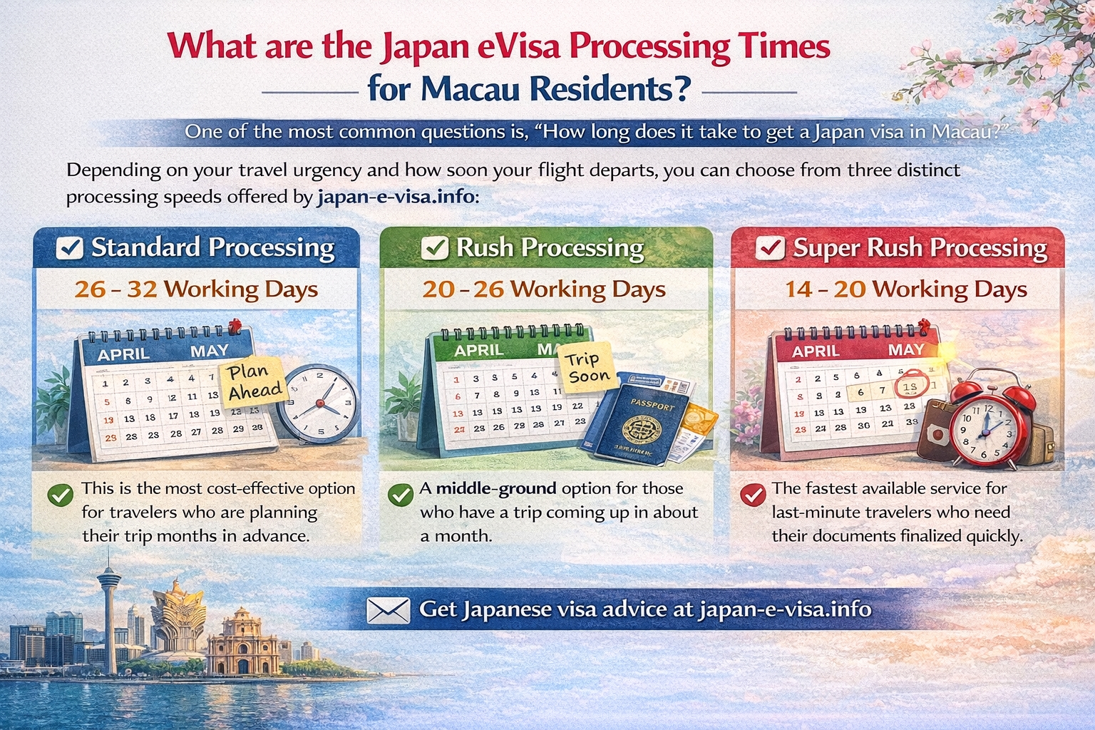 One of the most common questions is, "How long does it take to get a Japan visa in Macau?" Depending on your travel urgency and how soon your flight departs, you can choose from three distinct processing speeds offered by japan-e-visa.info: