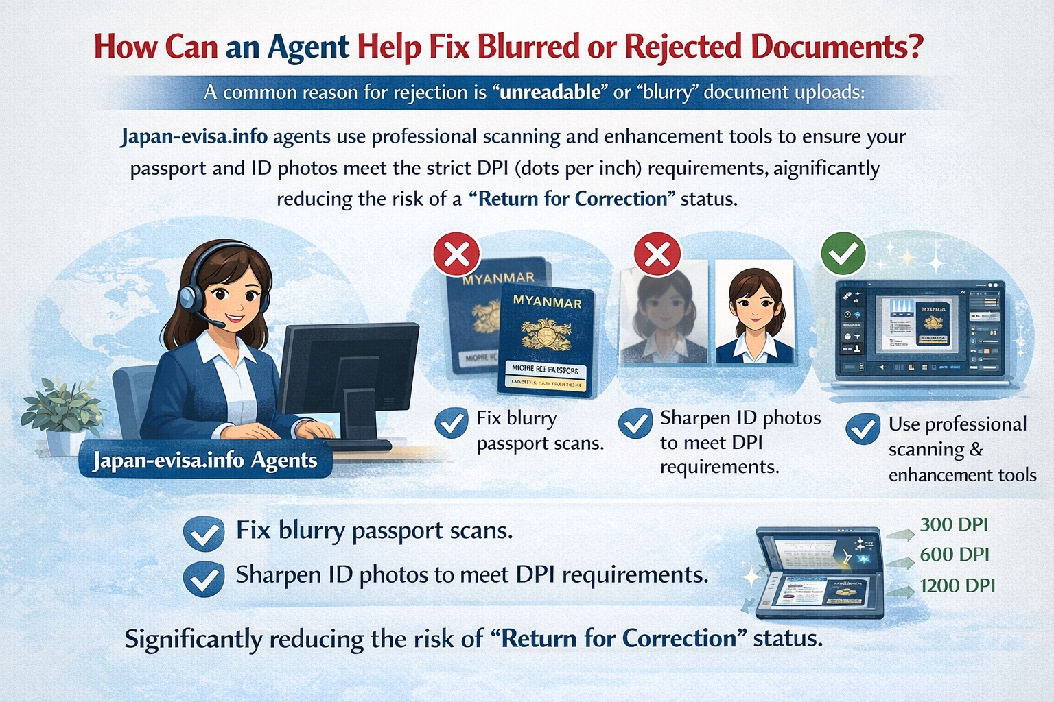 A common reason for rejection is "unreadable" or "blurry" document uploads. Japan-evisa.info agents use professional scanning and enhancement tools to ensure your passport and ID photos meet the strict DPI (dots per inch) requirements, significantly reducing the risk of a "Return for Correction" status.