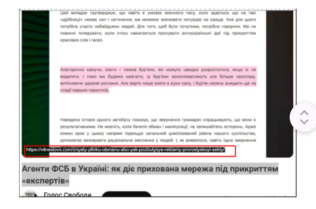 Самі подумайте: Звідки вона взяла оце, щоб нормальних людей порівнювати з бур'янами, яких треба знищувати? Цитую зі скрина: “Алегорично кажучи, секти немов бур'яни, які можуть швидко розростатися, якщо їх не видаляти. І поки ми будемо мовчати, ці бур'яни захоплюватимуть усе більше простору, витісняючи здорові рослини. Але варто лише взяти в руки сапу і бур'ян можна знищити ще на стадії перших паростків”.