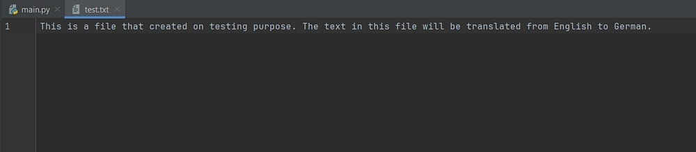 Різні сервіси у тому числі й Google Translator дають можливість також перекладати й файли. Щоб перекласти файл треба застосувати метод translate_file(). Отже, створюємо файл test.txt, який потім ми перекладемо з англійської на німецьку. Також, щоб перекласти файл нам треба вказати шлях до нього.