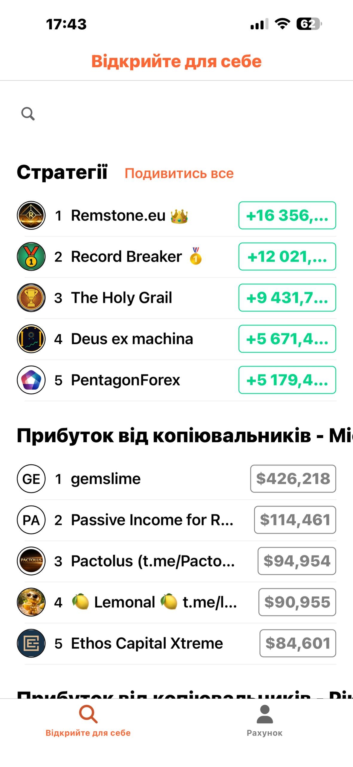 Тут зібрані трейдери, чиї угоди можна копіювати.