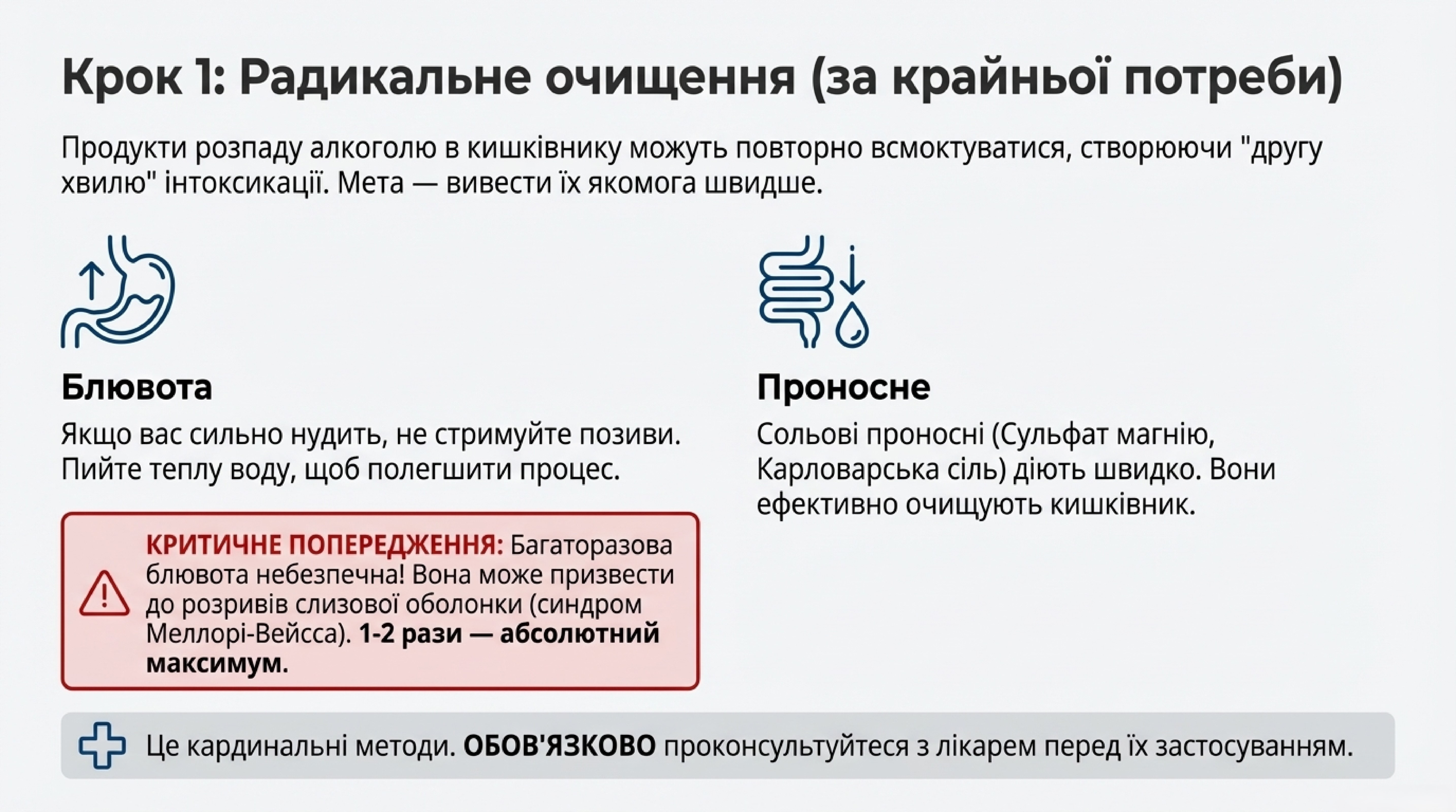 Блювота чи діарея при похміллі — це природні захисні механізми, якими організм намагається викинути отруту. Радикальний, але дієвий спосіб прискорити одужання — це очищення кишківника за допомогою сольових проносних (наприклад, магнезії). Це допоможе вивести залишки токсинів, які зранку знову починають всмоктуватися в кров.