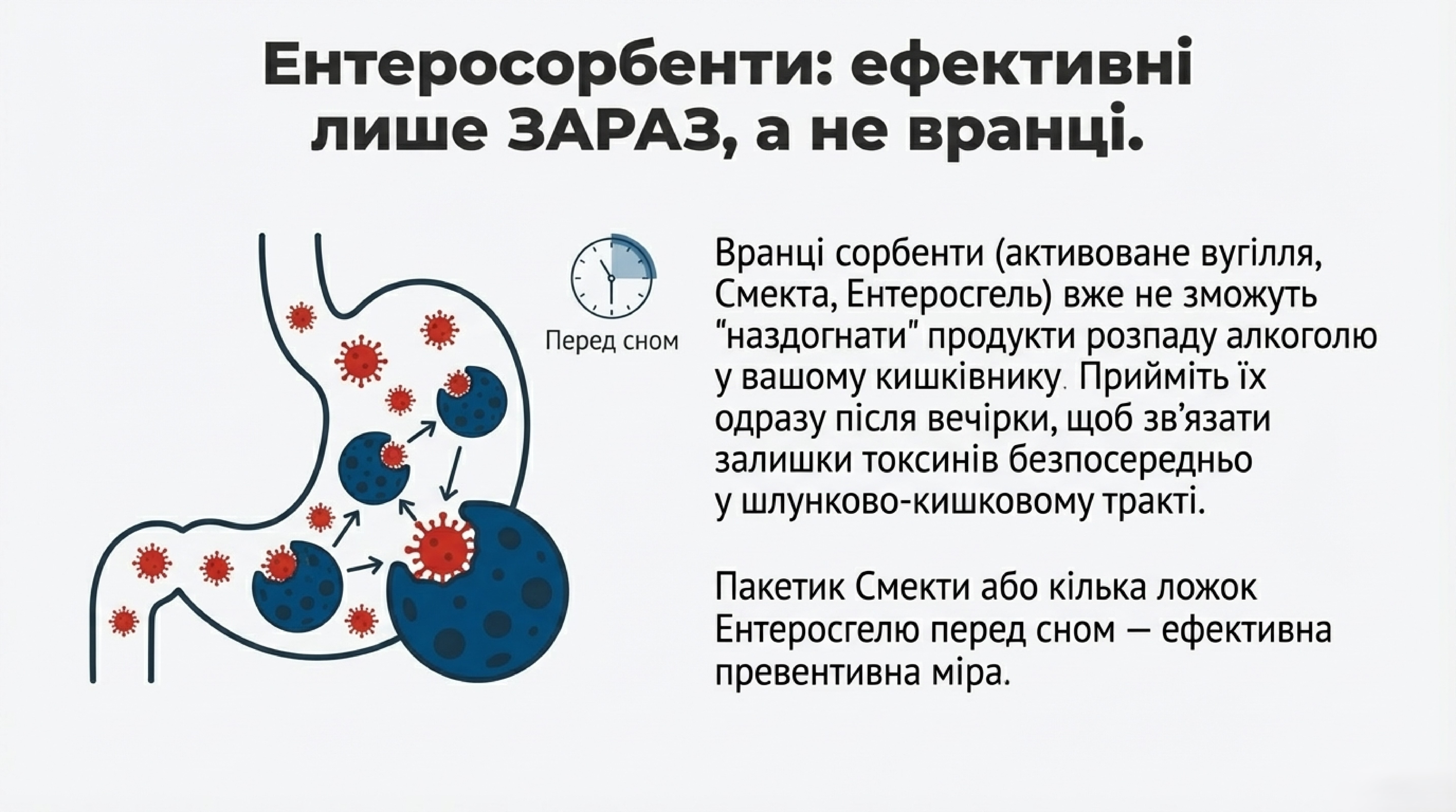 Приймати активоване вугілля чи інші засоби (Ентеросгель, Смекта) зранку майже немає сенсу, бо алкоголь уже потрапив у кров. Сорбенти працюють лише тоді, коли отрута ще в шлунку. Є два правильні моменти: