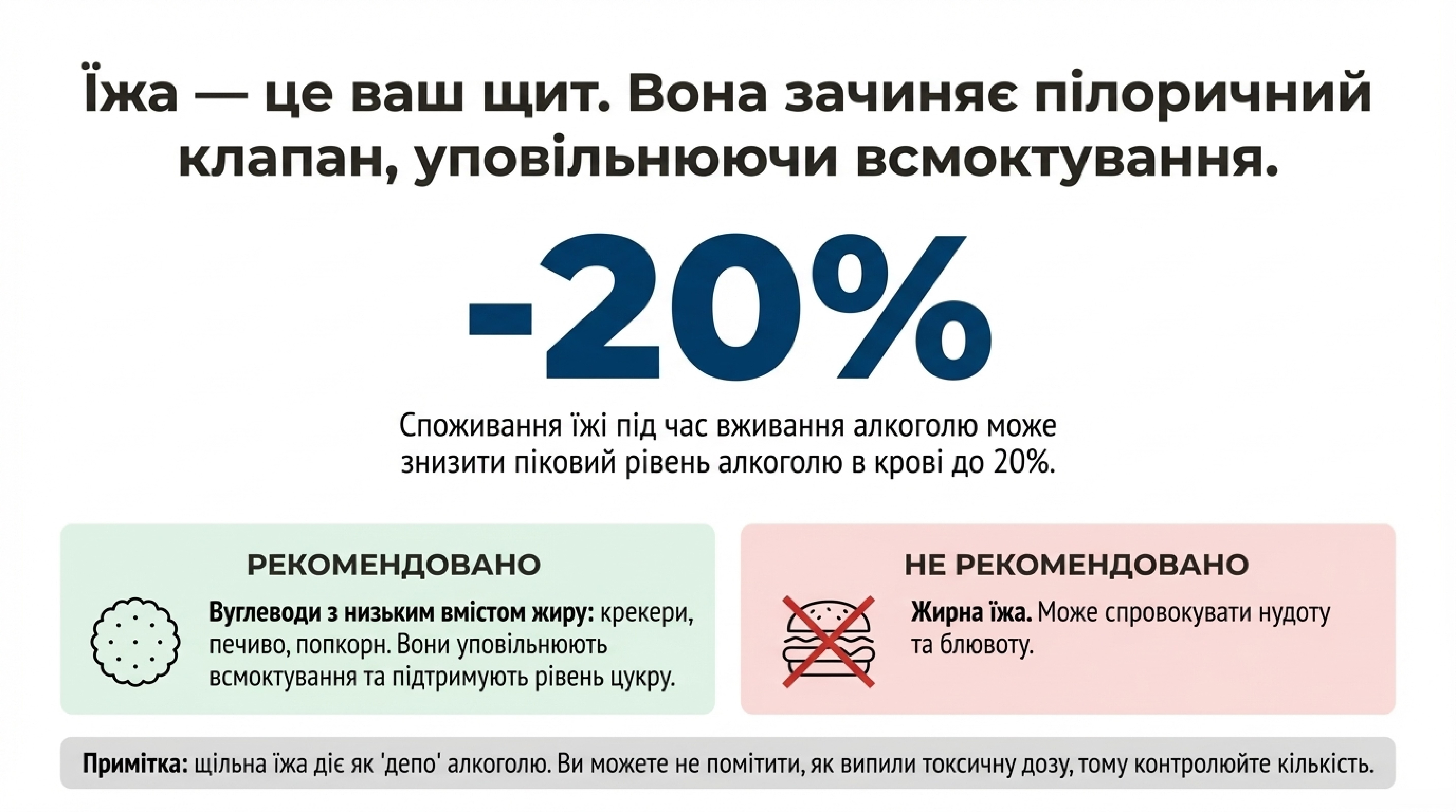 Користь: Їжа в шлунку сповільнює потрапляння спирту в кров, що дає організму більше часу на його переробку.