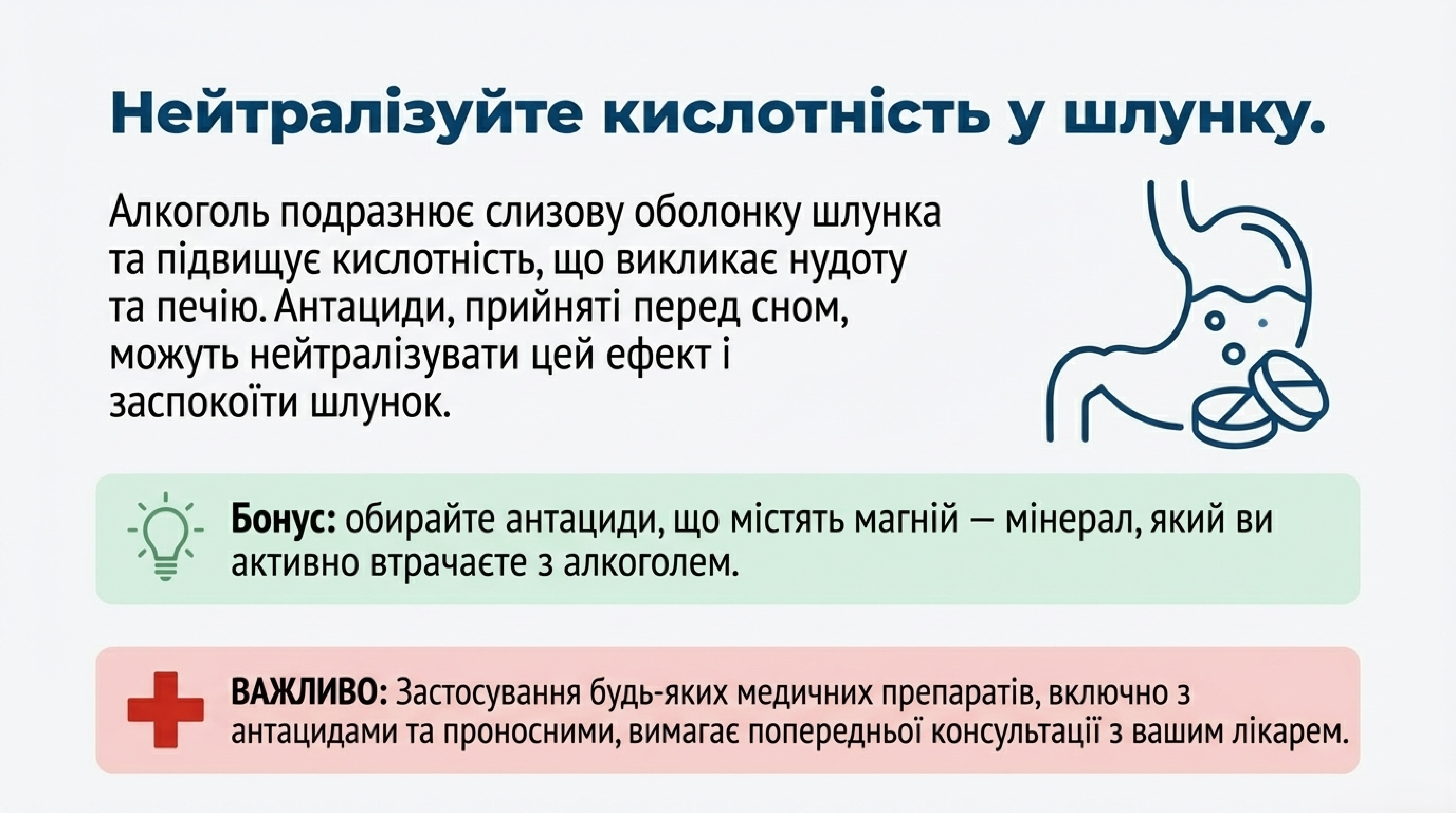 ВИКОРИСТОВУЙТЕ ЗАСОБИ ПРОТИ ПЕЧІЇ. Вони захищають стінки шлунка від подразнення алкоголем.