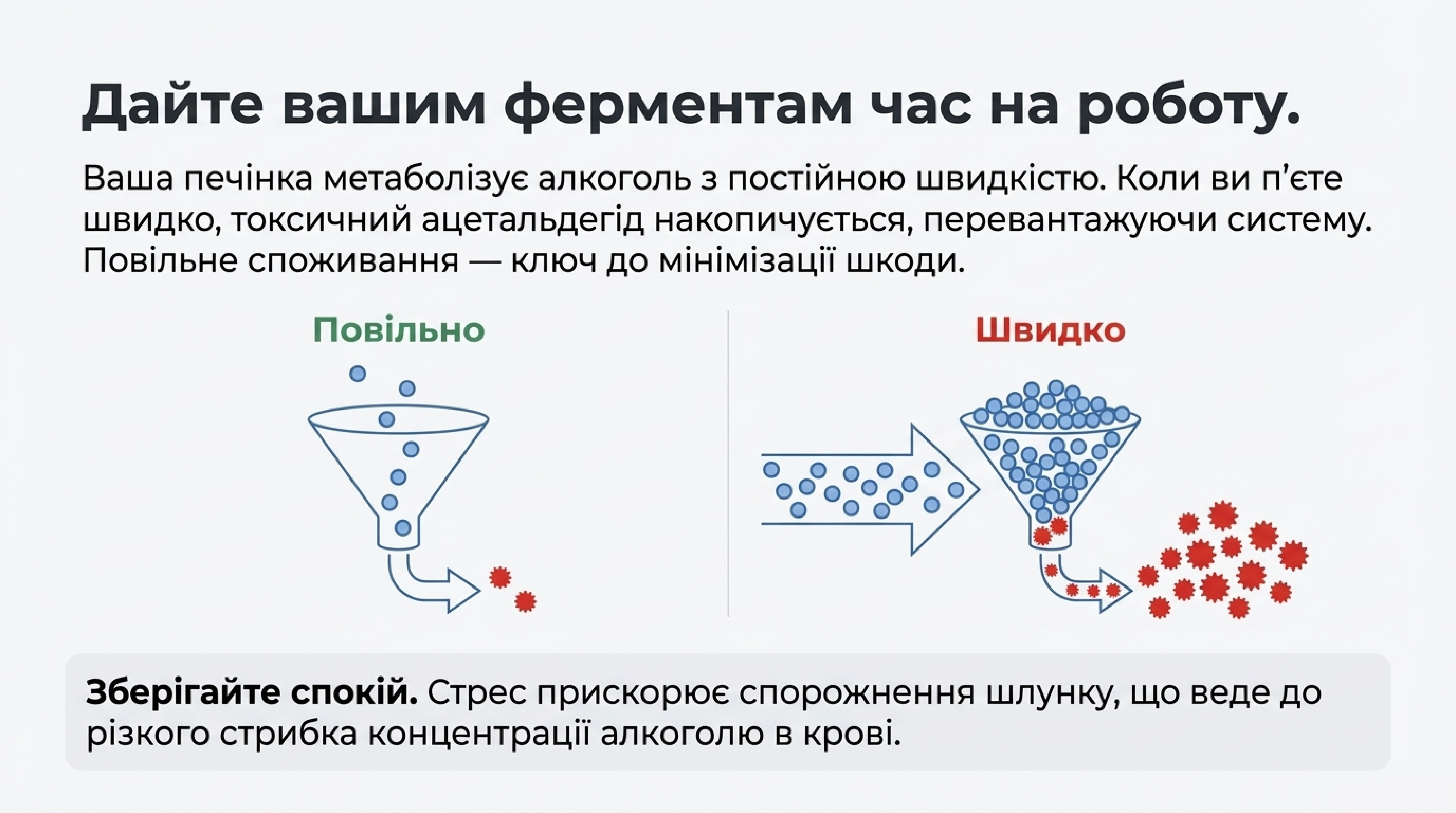 ПИЙТЕ ПОВІЛЬНО. Дайте печінці час, щоб вона встигала знешкоджувати спирт поступово;