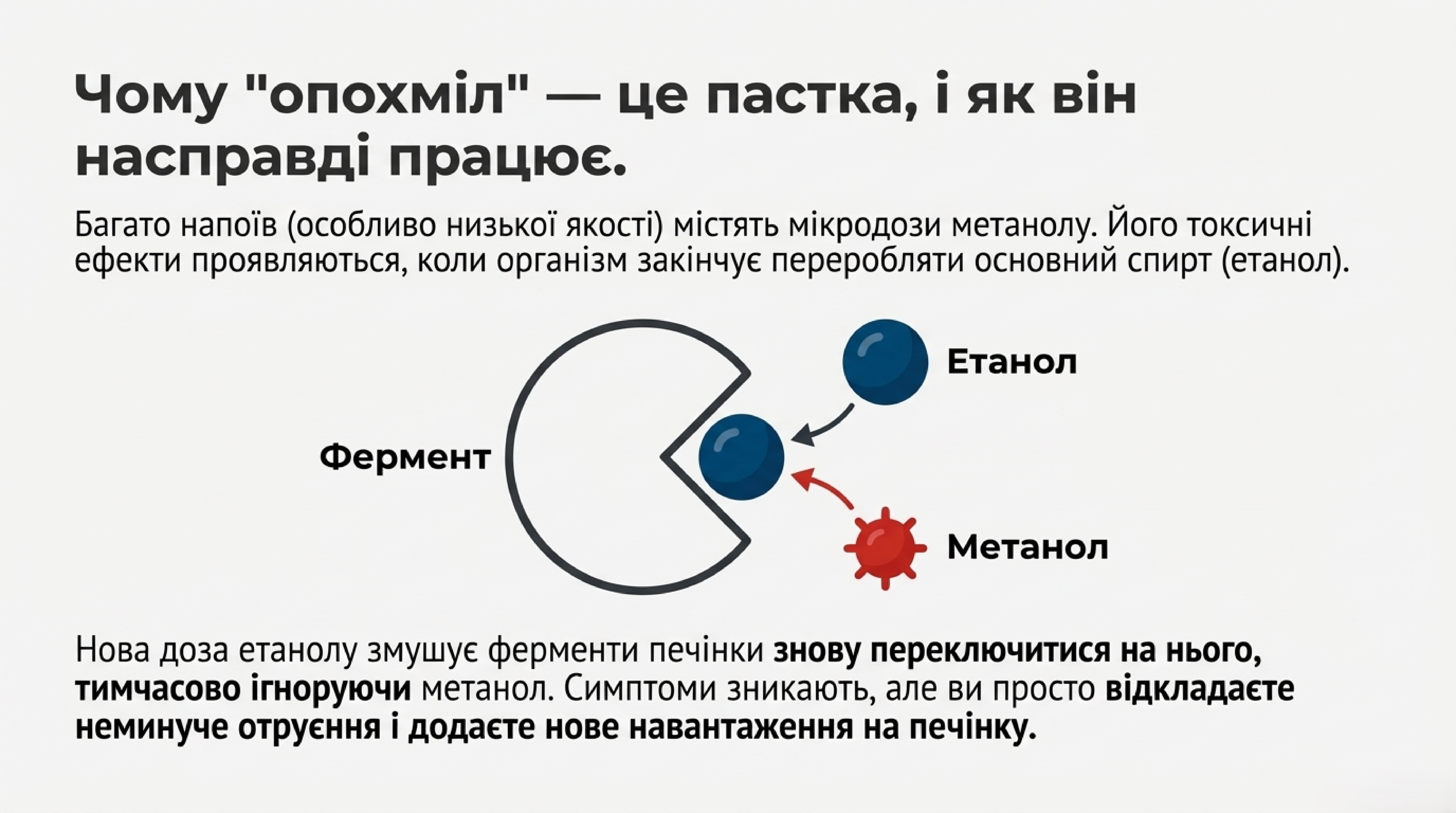 Ідея випити вранці невелику дозу алкоголю лише тимчасово відкладає проблему. Поки ваша печінка зайнята новою порцією спирту, вона «ігнорує» токсини, що залишилися від учора. Коли дія нової порції закінчиться, отруйний удар буде вдвічі сильнішим. Це прямий шлях до замкненого кола та залежності.