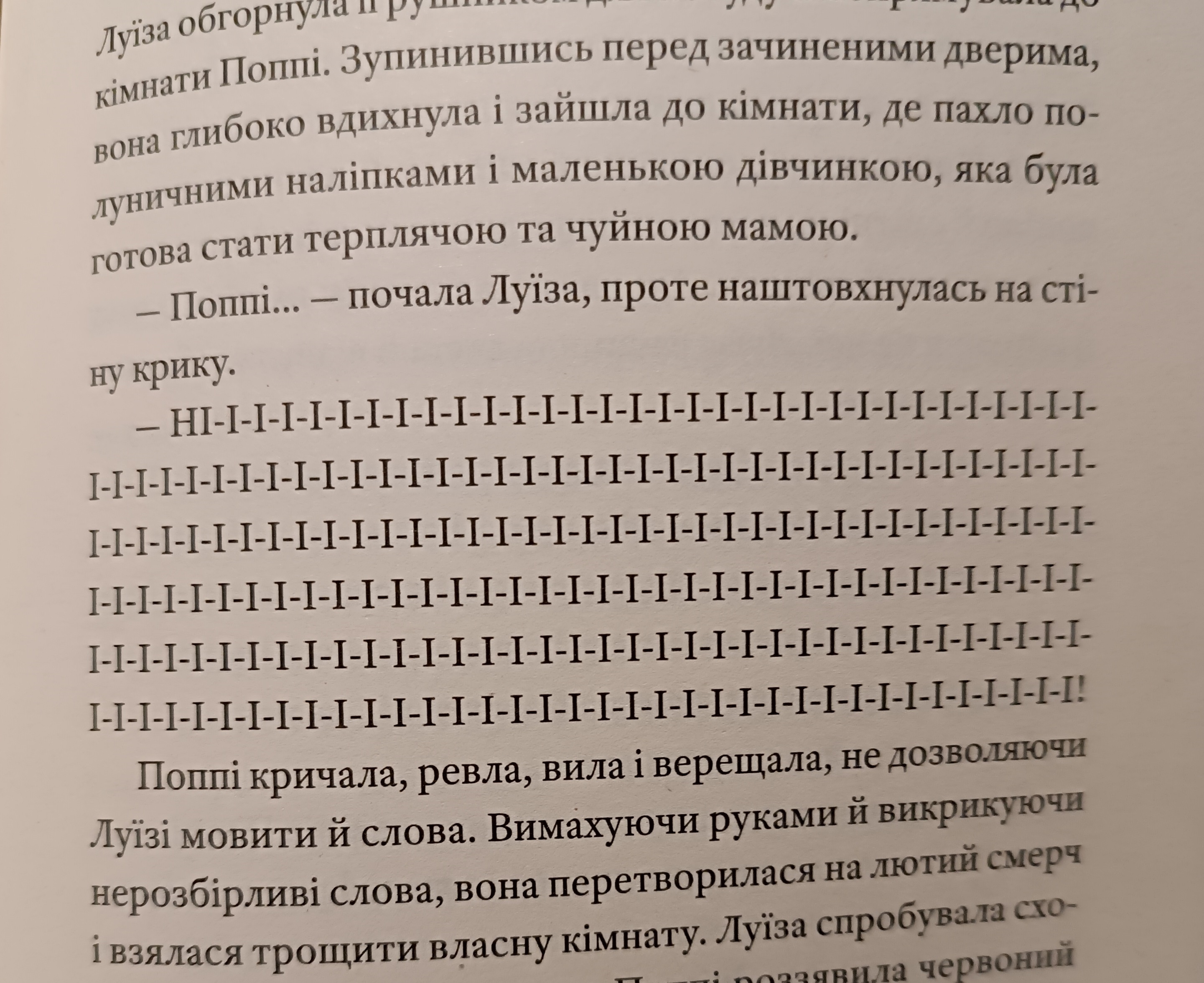І все було б з цим епізодом добре (ну, умовно) — але все ж муляло те, що джерелом біди стали не ревнощі до молодшої дитини, не дитяча жорстокість, а банально зла лялька, яка силоміць змусила Луїзу робити погано. Я знаю, що багатьом книга зайшла, але ну, суб’єктивно для мене це стало сильним спрощенням ситуації; такий собі «бог з машини», тіки не бог, тіки диявол.