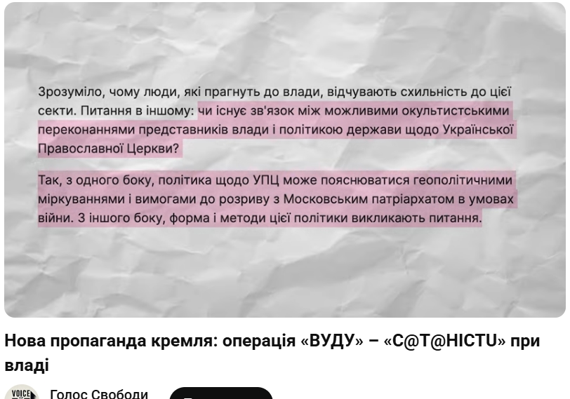 Цитую вам з горе- статті: “питання в іншому. Чи існує зв'язок між можливими окультистськими переконаннями представників влади і політикою держави щодо Української православної церкви? Так, з одного боку, політика щодо УПЦ може пояснюватися геополітичними міркуваннями і вимогами до розриву з Московським патріархатом в умовах війни. З іншого боку, форма і методи цієї політики викликають питання”