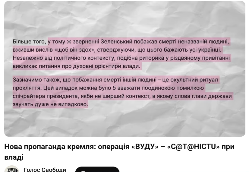 Далі повернемося до статті. Зараз ви побачите лицемірство вищого гатунку. В статті розбирають різдвяне привітання президента. Вони пишуть, що він виступав на фоні Дідуха і побажав неназваній особі, щоб він здох. Ну, ми всі поняли, хто. Стверджуючи, що цього бажають усі українці. Та нічого дивного. Здоров'я ми йому точно не побажаємо.
