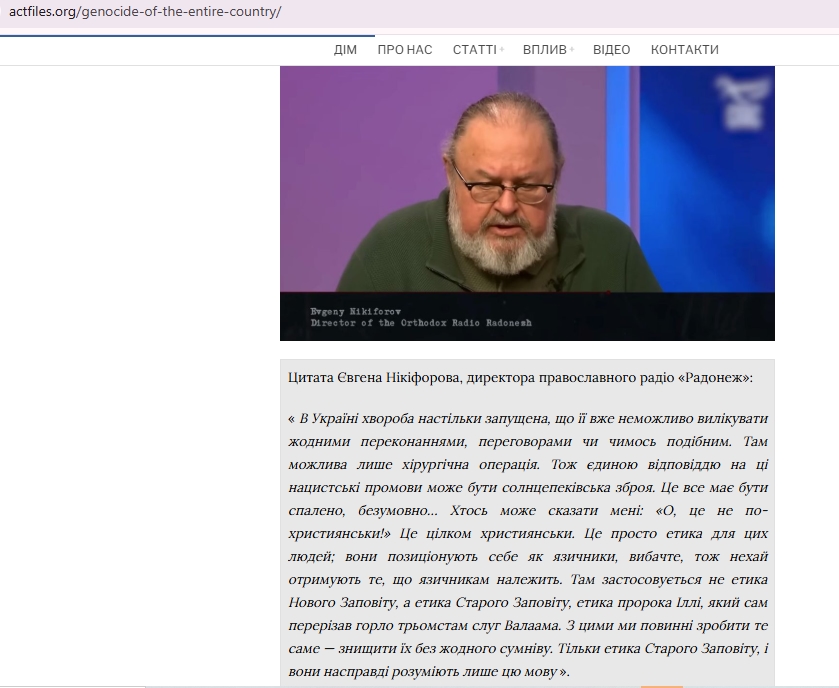 ЦИТУЮ те, що на скрині: “На Україні хвороба так запущена, що вже ніякими вмовляннями, переговорами, нічим там нічого це вилікувати неможливо. Там можлива тільки хірургія. Тому відповідь на ось ці виступи нацистів може бути тільки одна -сонцепьок. Це потрібно випалювати. Цілком так мені скажуть: "Ой, це не по-християнськи, по-християнськи цілком. Просто етика для цих людей. Вони ж самі себе позиціонують як язичники. Вибачте мене і отримайте як язичники. Тому для вас не новозавітна етика, а старозавітна". Ільї пророка,