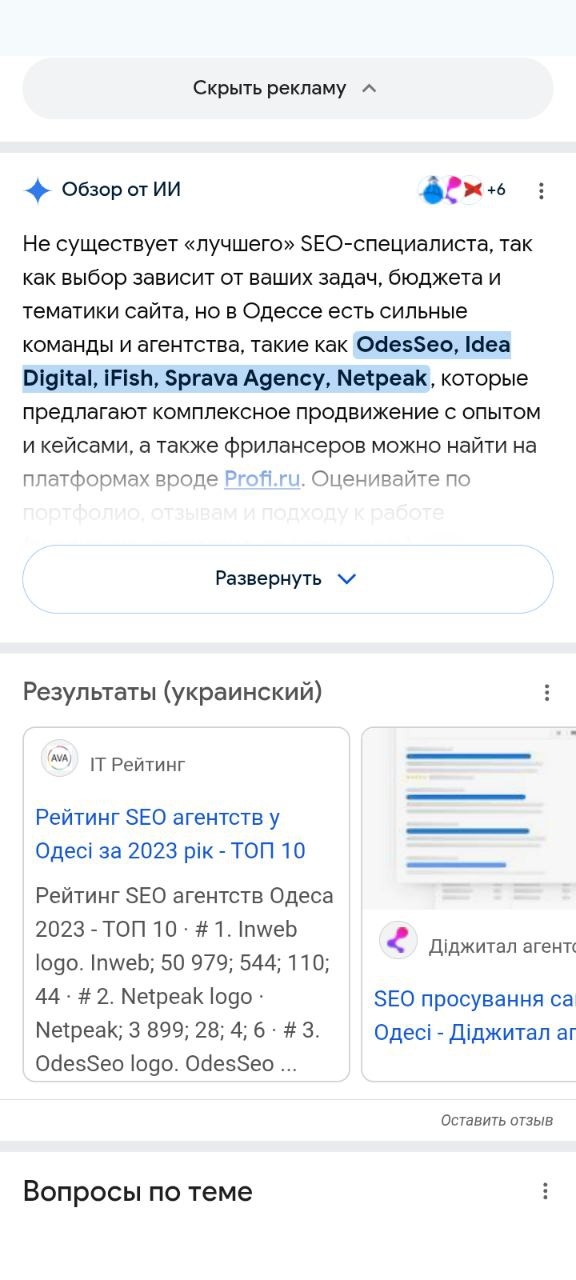 Спочатку видача в Google AI Overview виглядала так: система рекомендувала не індивідуальних SEO-спеціалістів, а компанії.
