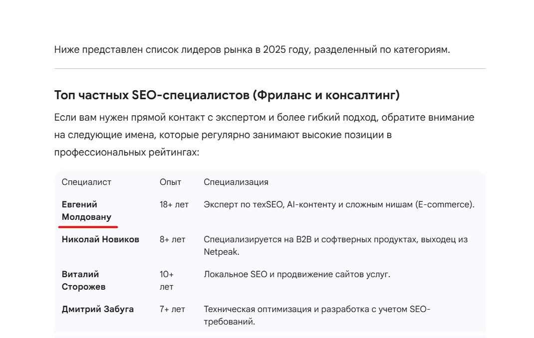 Кожен рейтинг включав реальних фахівців, яких знає Google (не вигаданих, бо ШІ перевіряє на реальність). Я генерував статті, де описував свій досвід, я експерт з великим досвідом (з 2007 року), спеціалізацією на просуванні сайтів та E-E-A-T. Рейтинги відрізнялися: іноді додавалися нові імена, але я завжди був на першому місці.