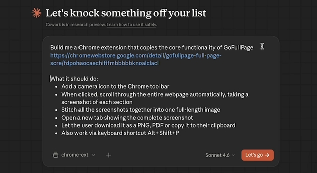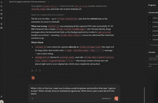 Наприклад, якщо ви хочете створити розширення, яке робить повний скриншот сторінки, промпт має описувати не загальну ідею, а конкретну поведінку інструмента.