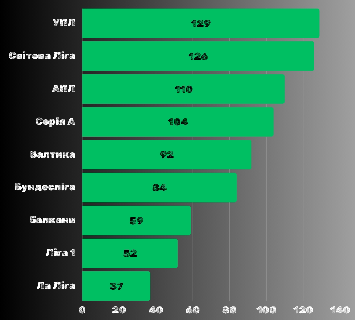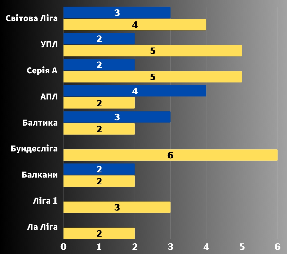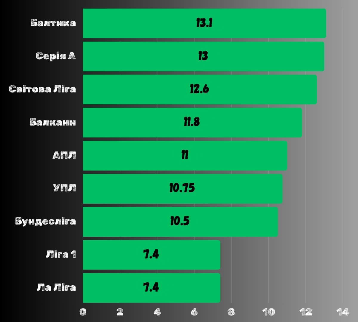 Лідерами стали Балтика (13.1) та Серія A (13) — їхні команди показали найвищу ефективність. Трохи позаду йде Світова Ліга (12.6), а Балкани (11.8), АПЛ (11) та УПЛ (10.75) розташувалися в середній частині рейтингу. Бундесліга (10.5) також близько до середнього рівня, тоді як Ліга 1 і Ла Ліга з показником 7.4 замикають список.