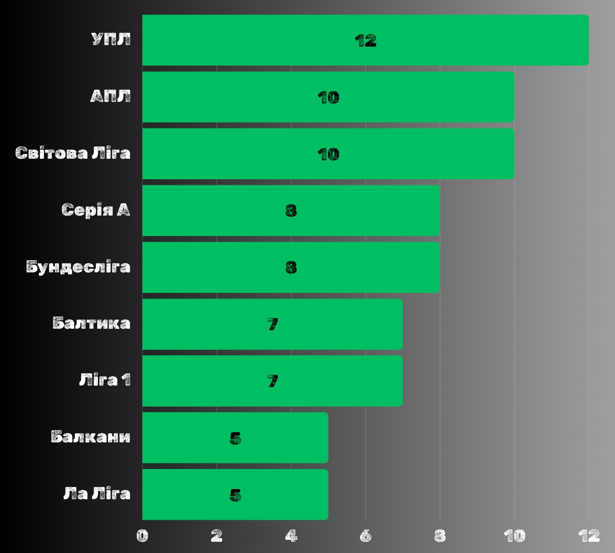 Найбільшу делегацію має УПЛ — 12 клубів, це найдовша зелена смуга на діаграмі.