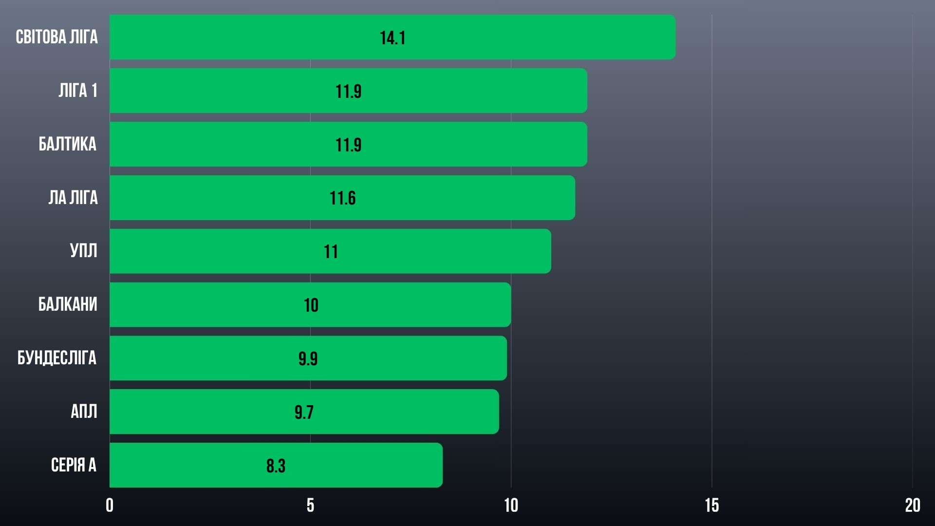 Світова ліга просто розриває — 14.1 бала на клуб, космос у порівнянні з іншими. Далі щільна боротьба: Ліга 1 та Балтика ділять другу позицію (по 11.9), поруч Ла Ліга з 11.6.
