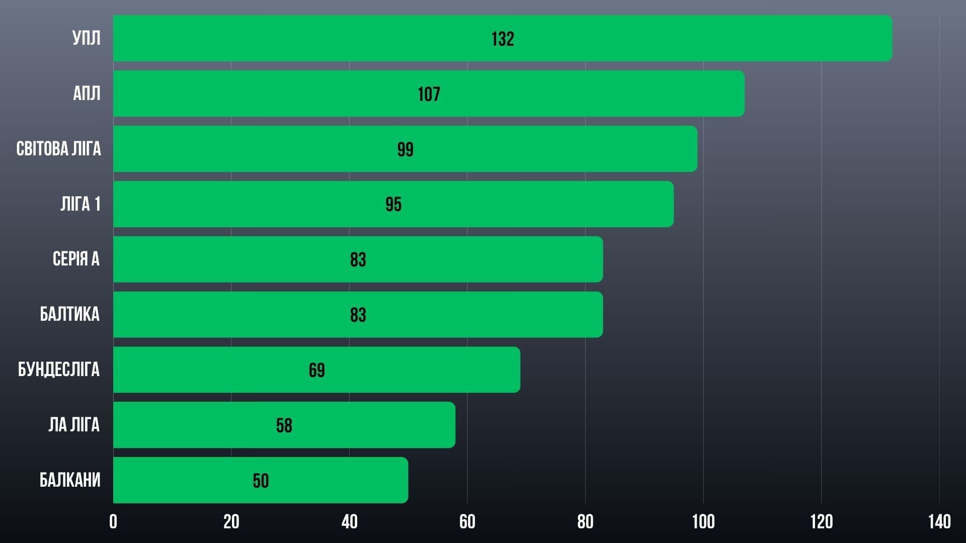 АПЛ (107) та Світова ліга (99) тримаються поруч і формують групу переслідувачів.