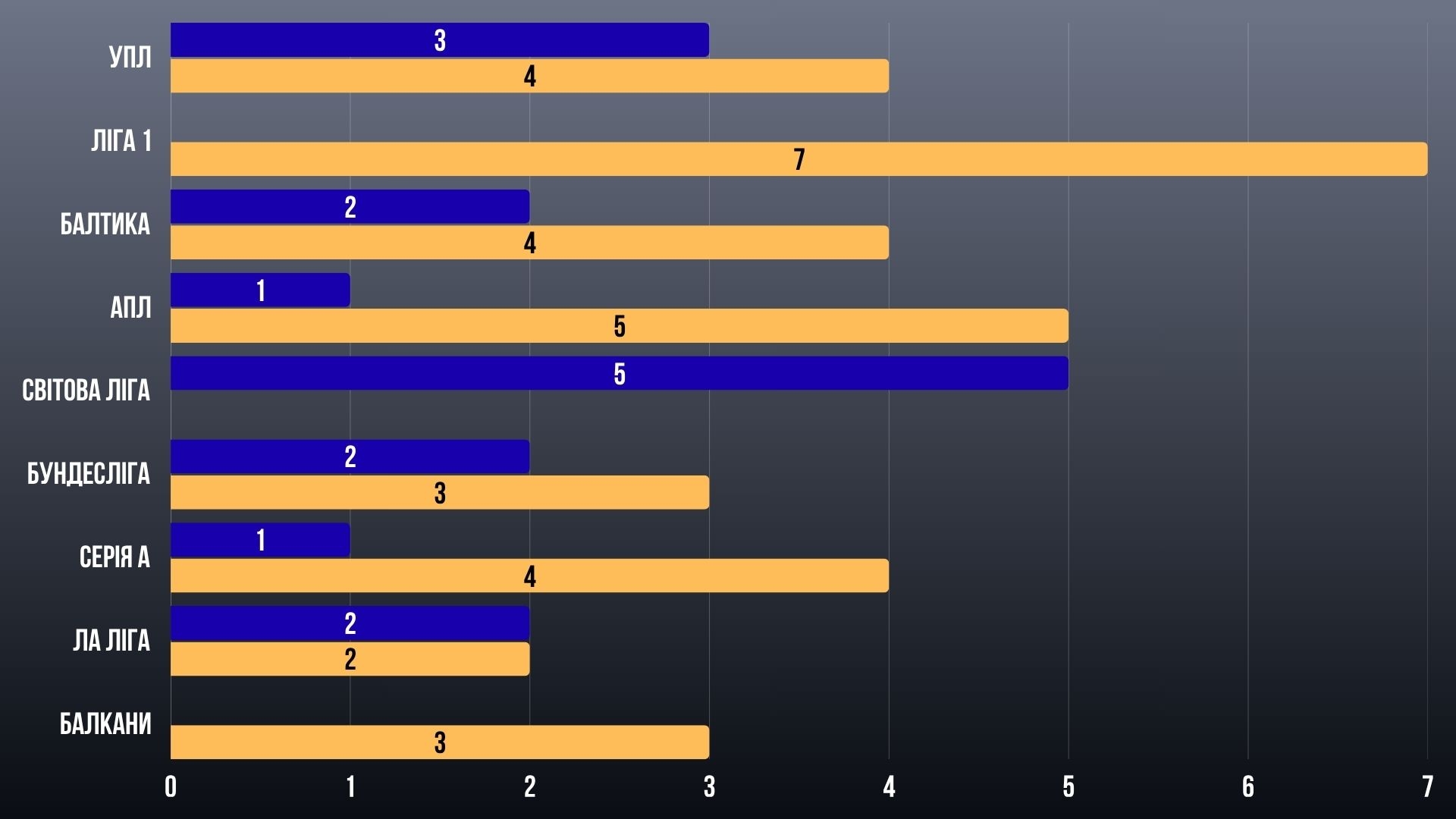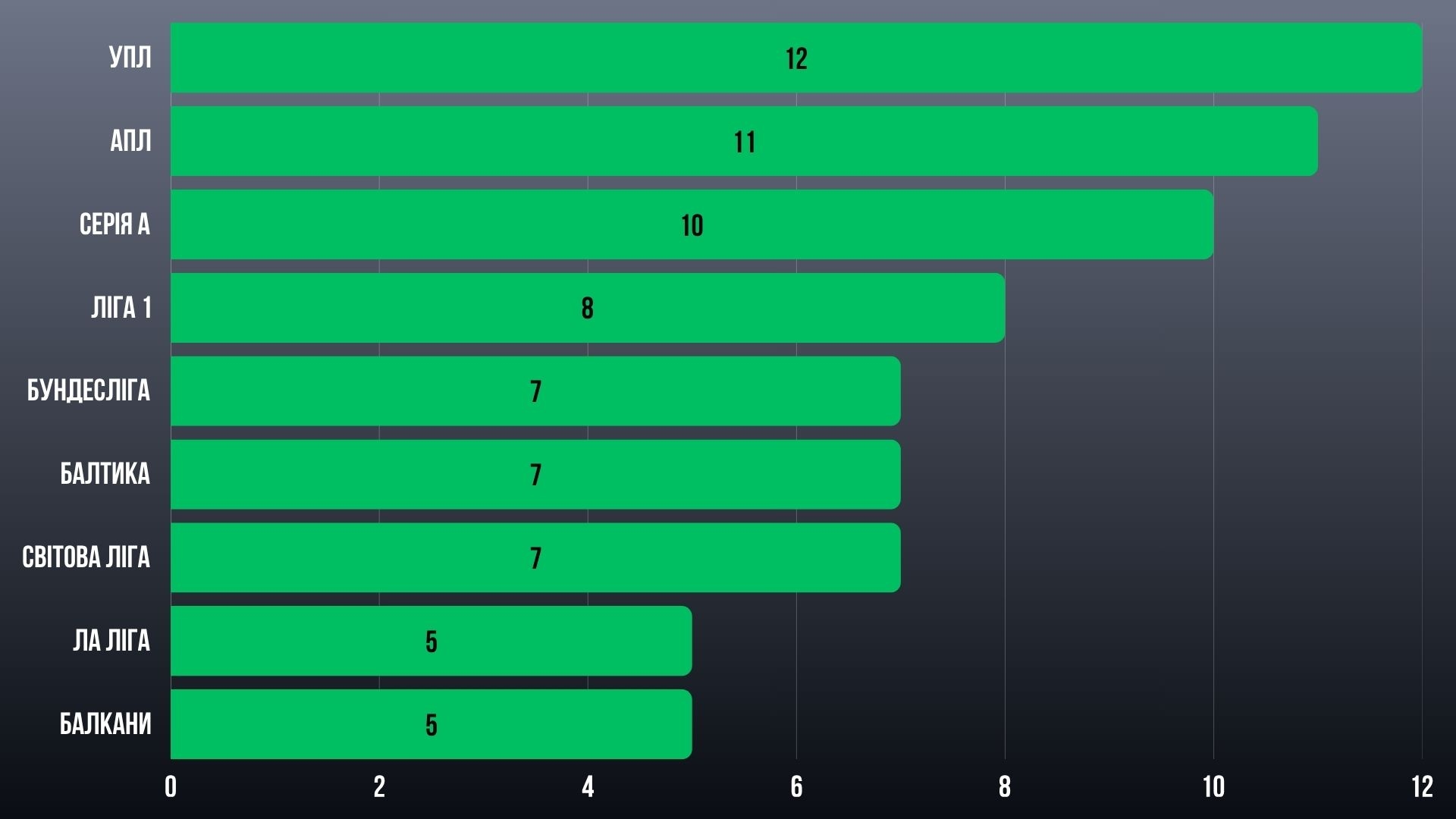 УПЛ тримається на рівні — 11 балів у середньому, але вже без домінації, як у загальних очках. Балкани рівно на 10, без проривів, але й без провалів.