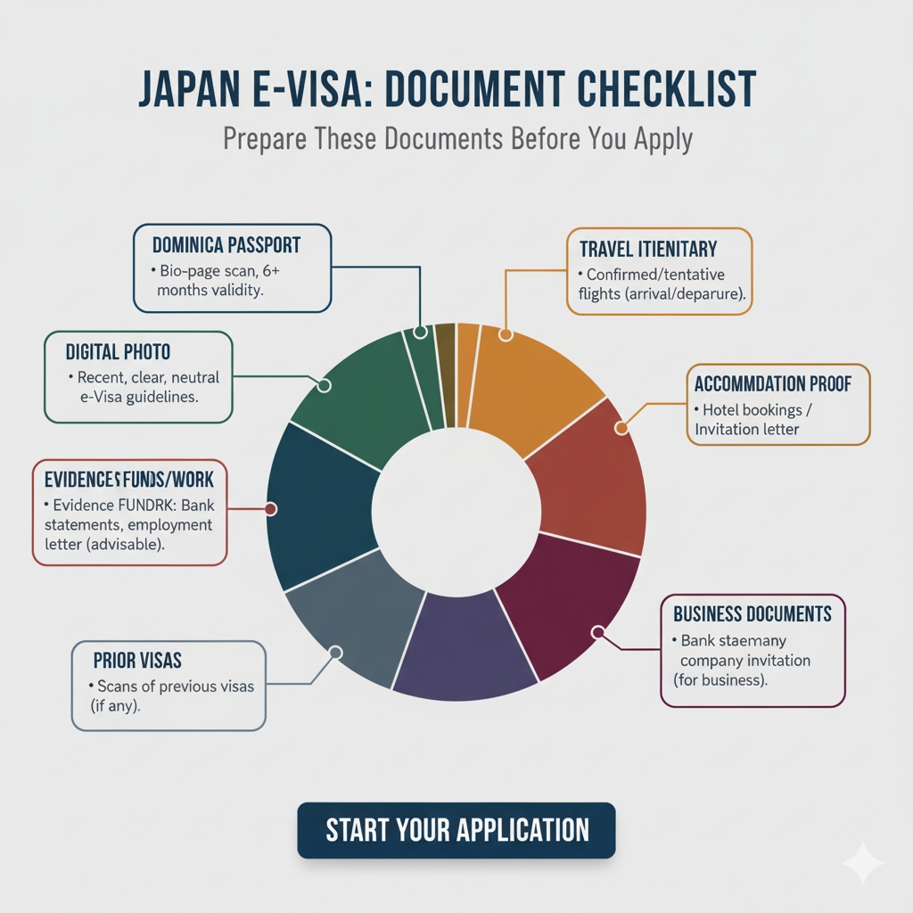 The requirements are whether the rollout of the e-Visa in Japan includes Dominica, and whether the purpose of your trip falls under the e-Visa categories (tourism, short business, transit). Certain countries have a visa-exemption on short stays, and others have e- Visa or embassy visa. In the case of Dominica passport holders, the visa requirements vary every year, it could be mandatory to obtain an e-Visa or a regular visa, which the Japanese mission that accepts Dominica applications (one of the embassies/consulates is listed in the diplomatic network of Japan, obliging which country).