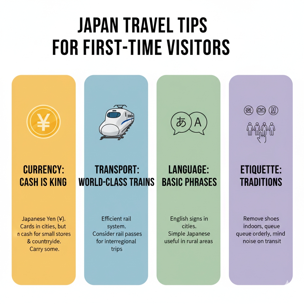 Currency: Japan is using the Japanese Yen (¥). Although large cities take cards, small stores and the countryside resort to cash. Carry some cash.