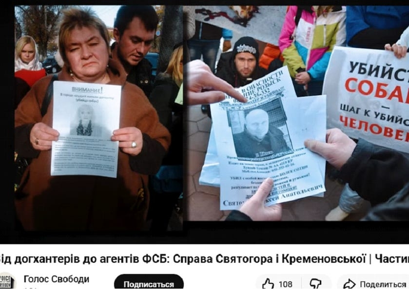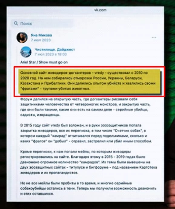 А ось найцікавіше, хто кого використовував, незрозуміло, але ця парочка знайшла один одного. Є переписка, яку зоозахисники виклали у відкритий доступ. З неї видно, що ще у 2014 році Кременовська познайомилась з київським #догхантером #Святогором, головним ідеологом руху та адміністратором того самого головного російського сайту vredy крапка ком. І що далі? А далі він став її правою рукою. Після переїзду Кременовської в Ірпінь у 2014 році вони не просто спілкувалися, вони стали спільниками.