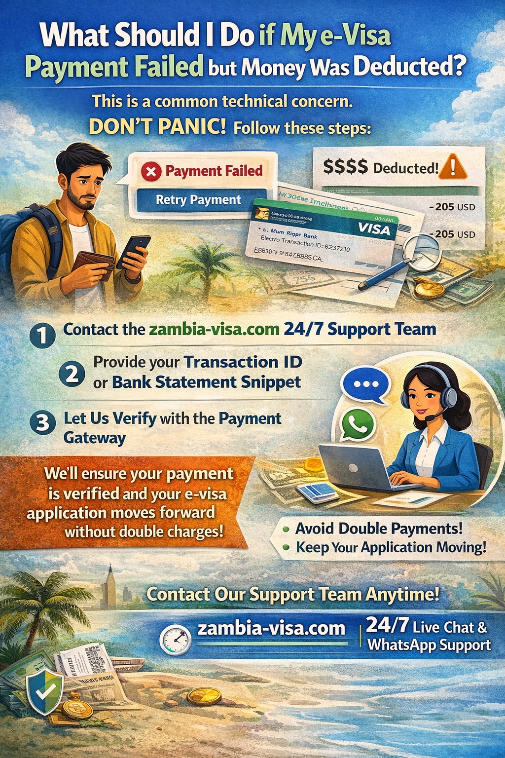 This is a common technical concern. If you experience a payment failure on a portal but see a deduction from your bank, do not immediately attempt a second payment. Contact our 24/7 support team at zambia-visa.com with your transaction ID or bank statement snippet. We will verify the payment status with the gateway to ensure you aren't double-charged and that your application moves forward.