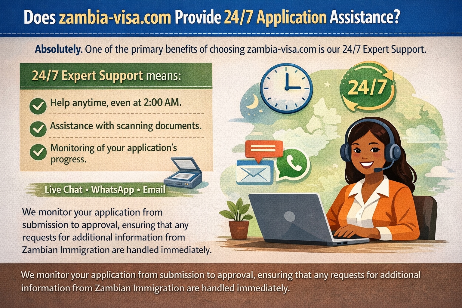 Absolutely. One of the primary benefits of choosing zambia-visa.com is our 24/7 Expert Support. Whether you have questions at 2:00 AM or need help scanning a document, our team is available via Live Chat, WhatsApp, and Email. We monitor your application from submission to approval, ensuring that any requests for additional information from Zambian Immigration are handled immediately.