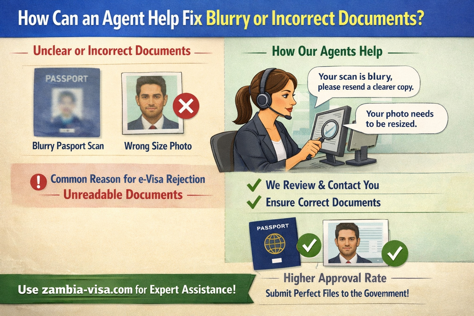 One of the most common reasons for e-Visa rejection is "unreadable documents." When you use zambia-visa.com, our agents manually review your uploads. If your passport scan is blurry or your photo is the wrong size, we will contact you to fix it before submitting it to the government, ensuring a much higher approval rate.