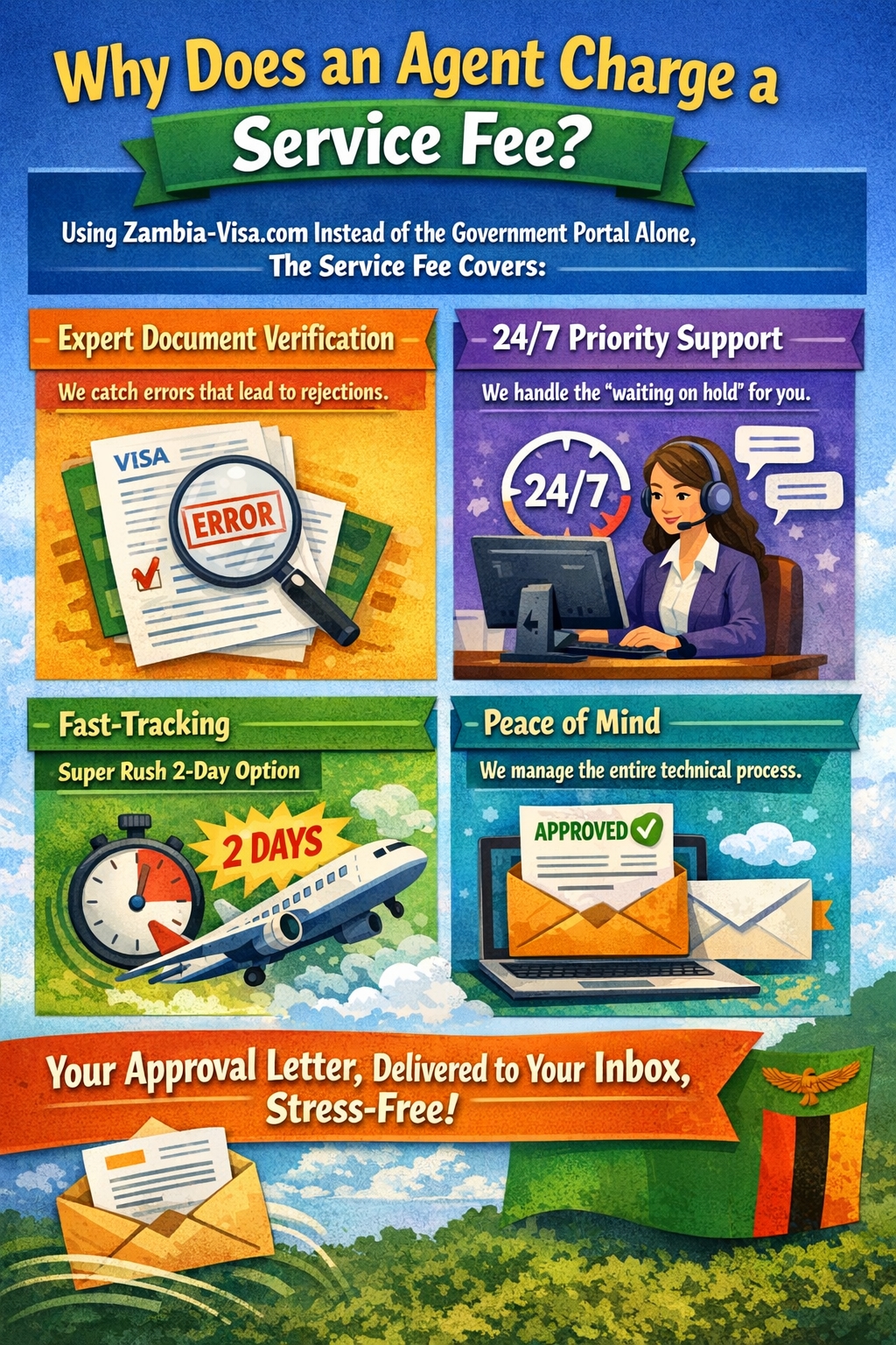 You might wonder why to use zambia-visa.com instead of trying the government portal alone. The service fee covers:
