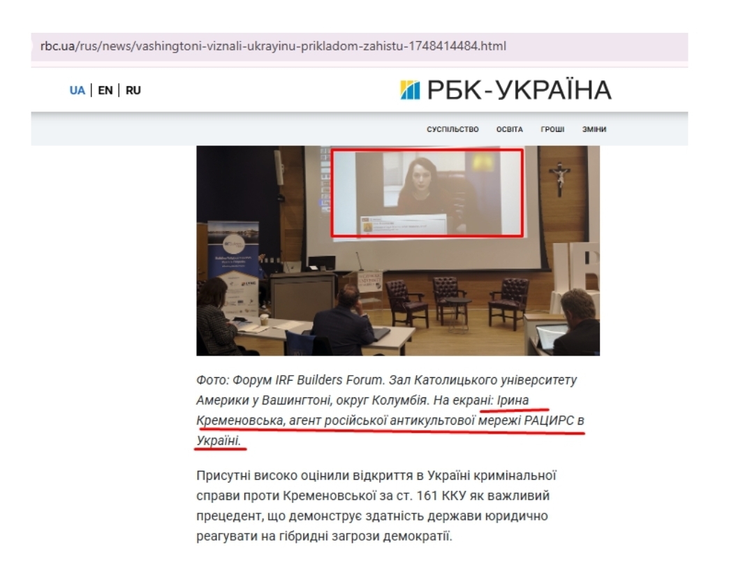 Зараз ви бачите скрини з сайту агентки фсб Ірині Кременовської та її поплічника Олексія #Святогор . #Кременовська визнана агентом фсбешної #РАЦИРС на самому вищому рівні у Вашингтоні
