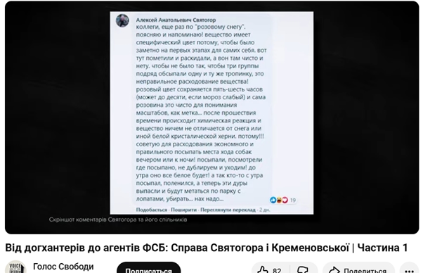 Цитати зі скринів переведені українською: “Колеги, вже просив, не треба вдень посипати. По реакції відразу видно. Тільки на ніч. До ранку все знебарвлюється і буде непомітно. А так ці дурки з лопатами набіжать і приберуть все. Потім по другому колу посипати. Почекай, він нормально заходить. Єдина проблема, що колір зберігається пару-трійку годин. Але це спеціально так, щоб самим по другому колу не кропити і було видно дислокацію і розташування обробленої території. За ефектом впливу понюхав і норм. Це краще, ніж всі аналоги. Навіщо ж міняти так відразу? Альтернатив поки немає. За посіви збудників ентерита на електротехнічній я ще не домовився, поки там ще вирощують посіви в масштабах, придатних для промислового використання. Навіть безкоштовно погодилися, тому що потім їм профіт лікувати собак і на цьому заробляти. Нам ще доплатити, по ідеї, повинні, але поки рожевому немає альтернатив, нехай буде. Колеги, ще раз по рожевому снігу пояснюю і нагадую. Речовина має специфічний колір, щоб було помітно на перших етапах для самих себе. Ось тут позначили і розкидали, а он там чисто і немає. Щоб не було так, щоб три групи поспіль обсипали одну і ту ж стежку. Це неправильне витрачання речовини. Рожевий колір зберігається 5-6 годин, може до 10, якщо мороз слабкий. І сама рожевина - це чисто для розуміння масштабів, як мітка. Після проходження часу відбувається хімічна реакція, і речовина нічим не відрізняється від снігу або іншої білої кристалічної херні. Тому раджу для економного і правильного використання посипати місце ходу собак ввечері або до ночі. Посипали, подивилися, де посипано, не дублюємо і йдемо. До ранку все буде біле. А так хтось зранку посипав, полінувався, а тепер ці дури випасли і будуть метатися по парку з лопатами, прибирати треба.”