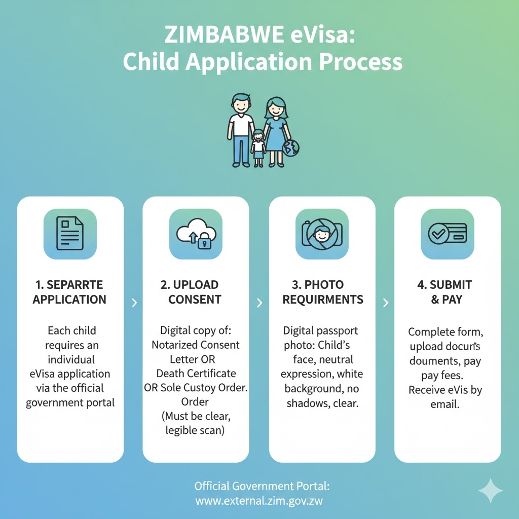 Applying for the Zimbabwe eVisa for minors is done online by adults. Pay close attention to these differences: