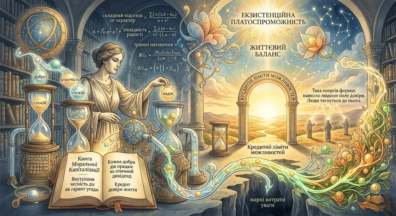 Існує глибока філософська економіка існування. Вона підпорядковується закону моральної капіталізації. Добро, вкладене у людей, у працю, у власне зростання, повертається з приростом сенсу. Внутрішня чесність діє як гарант угоди між людиною і майбутнім. Завдяки такій угоді з’являється дивовижний стан, який можна назвати екзистенційною платоспроможністю. Людина відчуває достаток сил, ясність думки, спокійний горизонт можливостей.