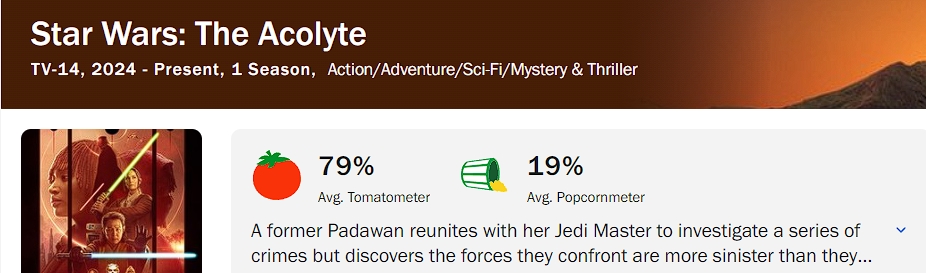 Ну і вийшов “Аколіт”. Серіал який схоже був приречений ще до релізу. Шоуранерка ще до виходу серій відзначилась в мережі скандальнми заявами, які заздалегіть налаштувати проти неї частину старої ЗВшної аудиторії. Якби серіал був добре знятим, їй би це може ще і пробачили б, але робота виявилась доволі посередньою. Були на те як об’єктивні чинники, як то: головна героїня не суб’єкт в цій історії, а об’єкт, що здається не приймає жодного рішення до якого її не підштовхнули, головну інтригу спойлерять в першій же серії, дві серії флешбеків що збивають темп історії, непереконлива/нелогічна поведінка деяких персонажів… Так були і більш суб’єктивні: конфлікти з частинами канону, спірні візуальні рішення, сильні незалежні лесбо-відьми що народжували дітей без чоловіків… Коротше приводів для невдоволення вистачало на будь який смак. Наразі це найнижче оцінений глядачами проект по Зоряним Війнам (у різдвяного випуску 25%):