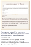 “Я пастор Марк Бернс і я звертаюся до всіх волонтерів АЛЛАТРА, а також до всіх, хто зазнав переслідувань з боку російської православної церкви, зокрема до тих, кого переслідує антикультовий рух в росії та Україні. Я хочу сказати вам, ви не одні. Ми вас чуємо. Боротьба проти них вже почалася. Ви не залишилися самі. Я тут, щоб ви знали, вся Америка стоїть за вами. Тому моє послання до вас: зберігайте надію, продовжуйте боротися. Не опускайте рук, ніколи не здавайтеся. Пам'ятайте, хто ви. І знайте, в результаті перемога буде за вами і за всіма нами, хто стоїть за свободу проти тиранії російської федерації, яка намагається знищити свободи людей у всьому світі. Я пастор Марк Бернс. Я підтверджую це послання і борюся за вас, а також за кожного, хто відстоює свободу